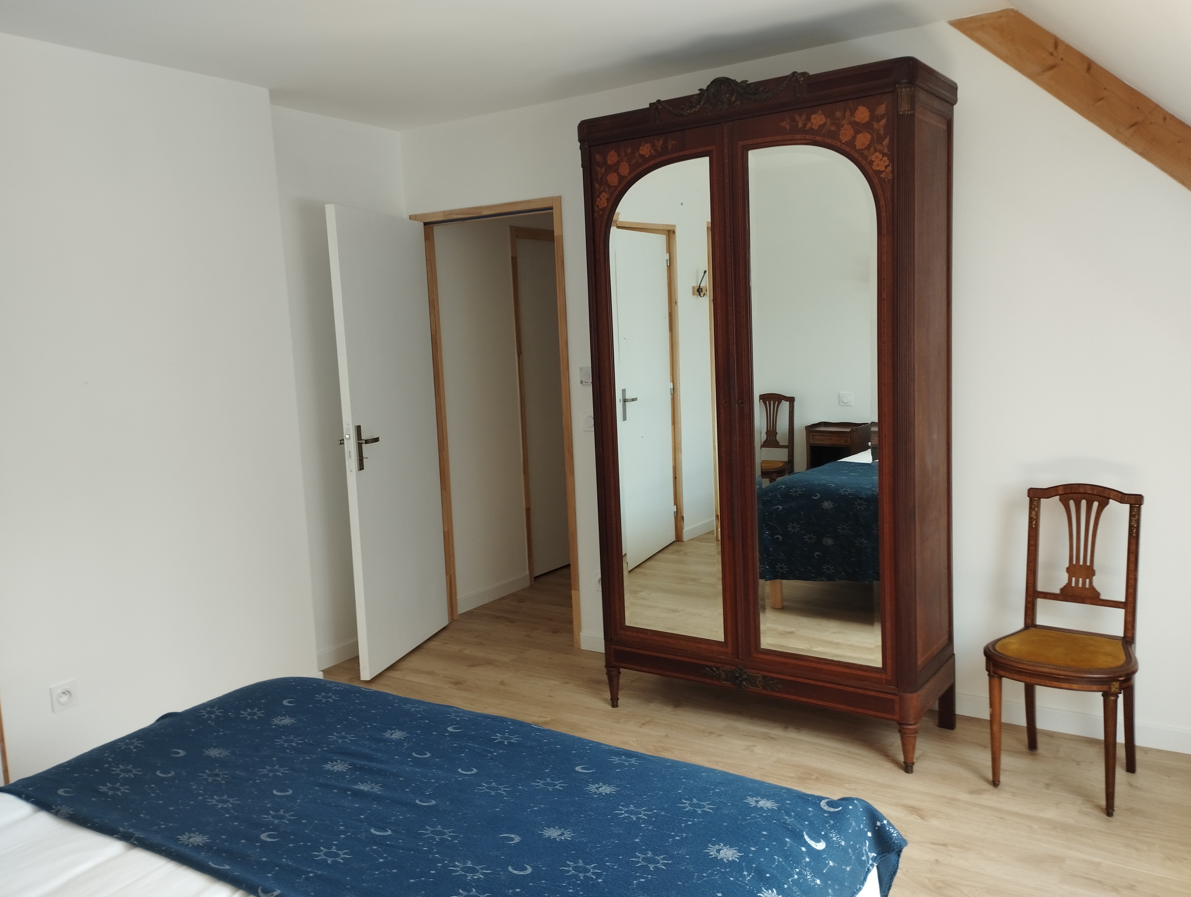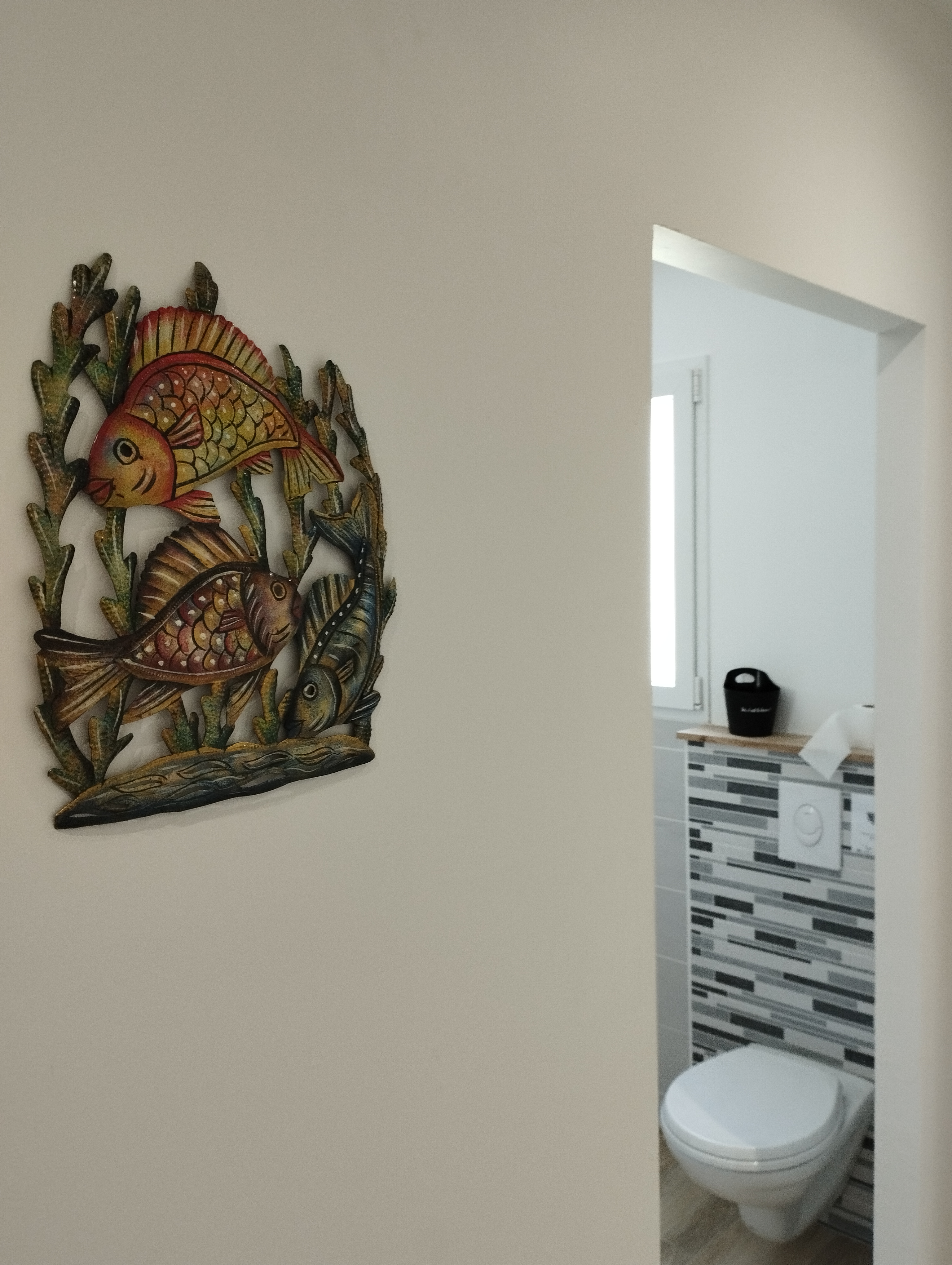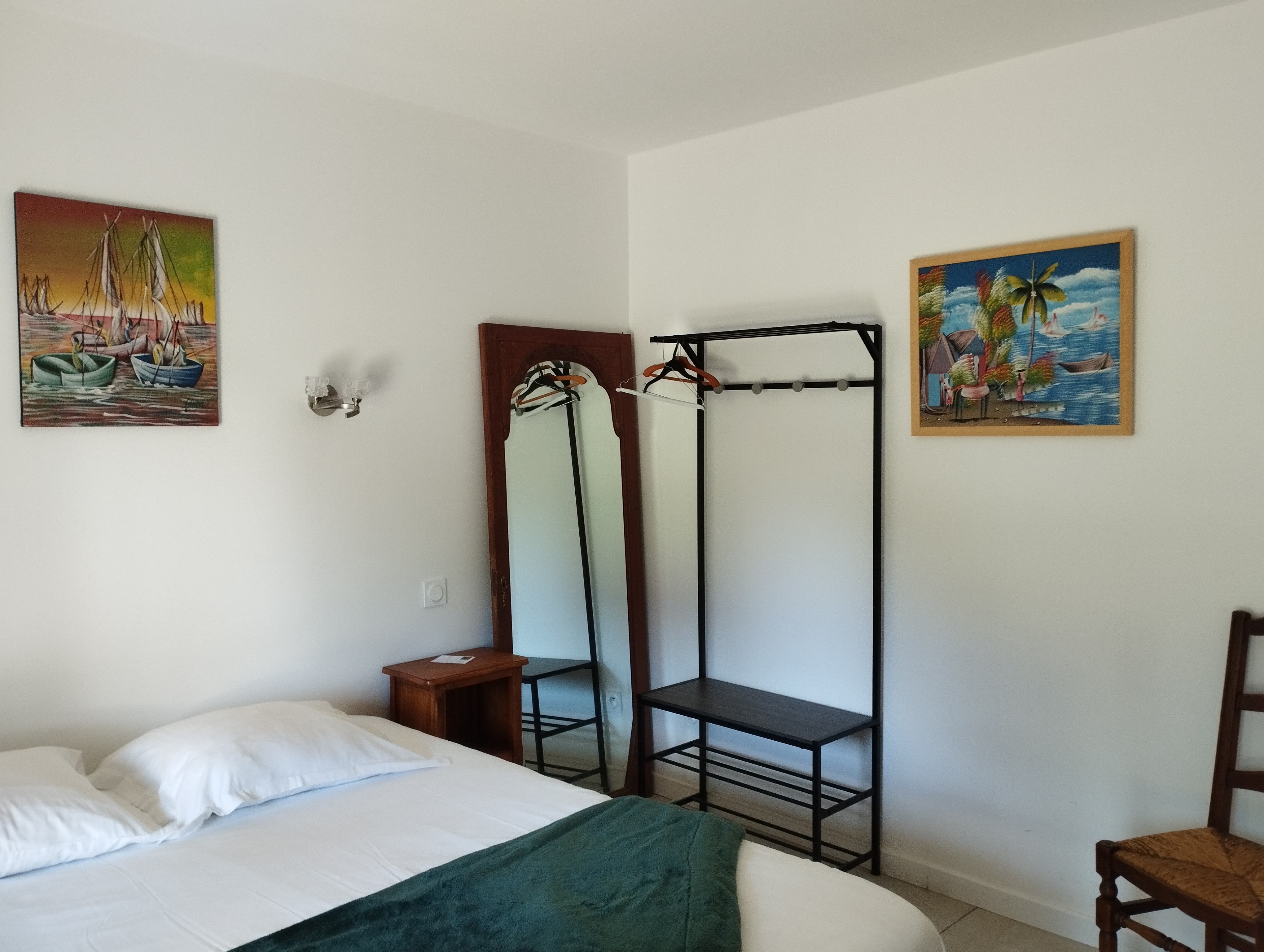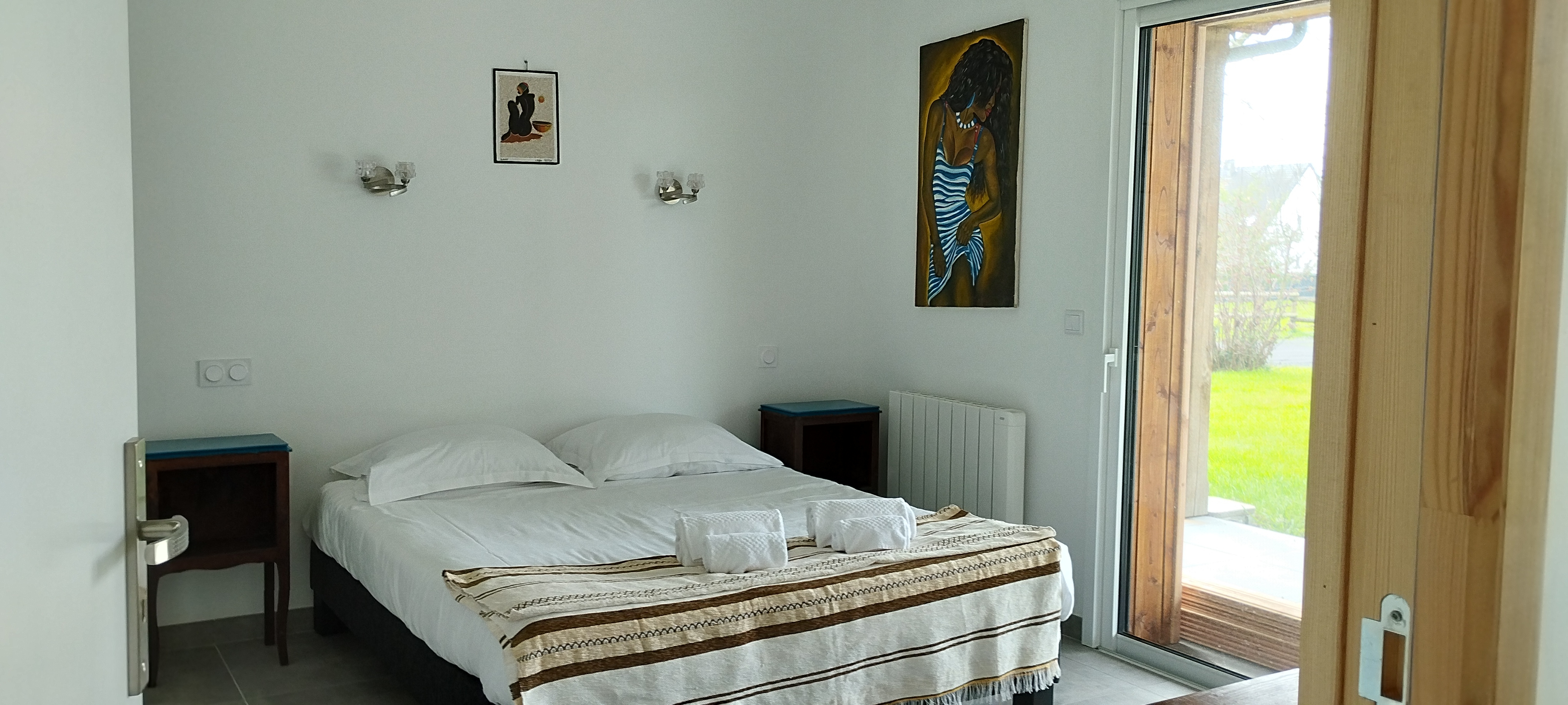 Chambre en rez-de-chaussée avec terrasse plein sud, idéale pour un séjour en bord de mer dans le sud de la Manche. Lit 160 cm, miroir, décoration inspirée d’Haïti (tableau et artisanat local).