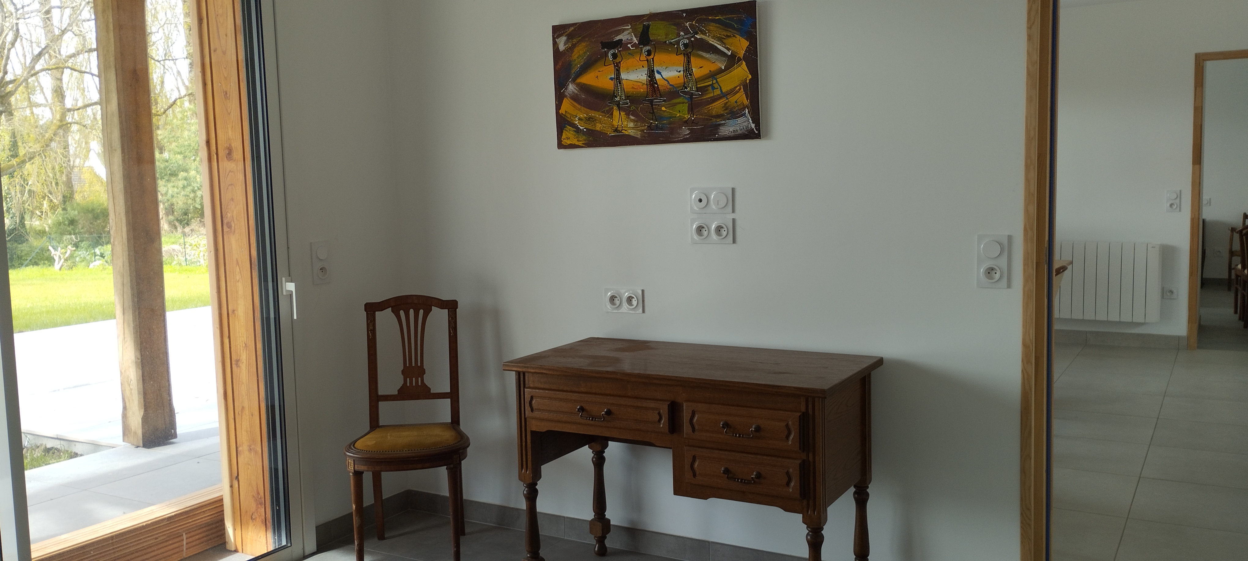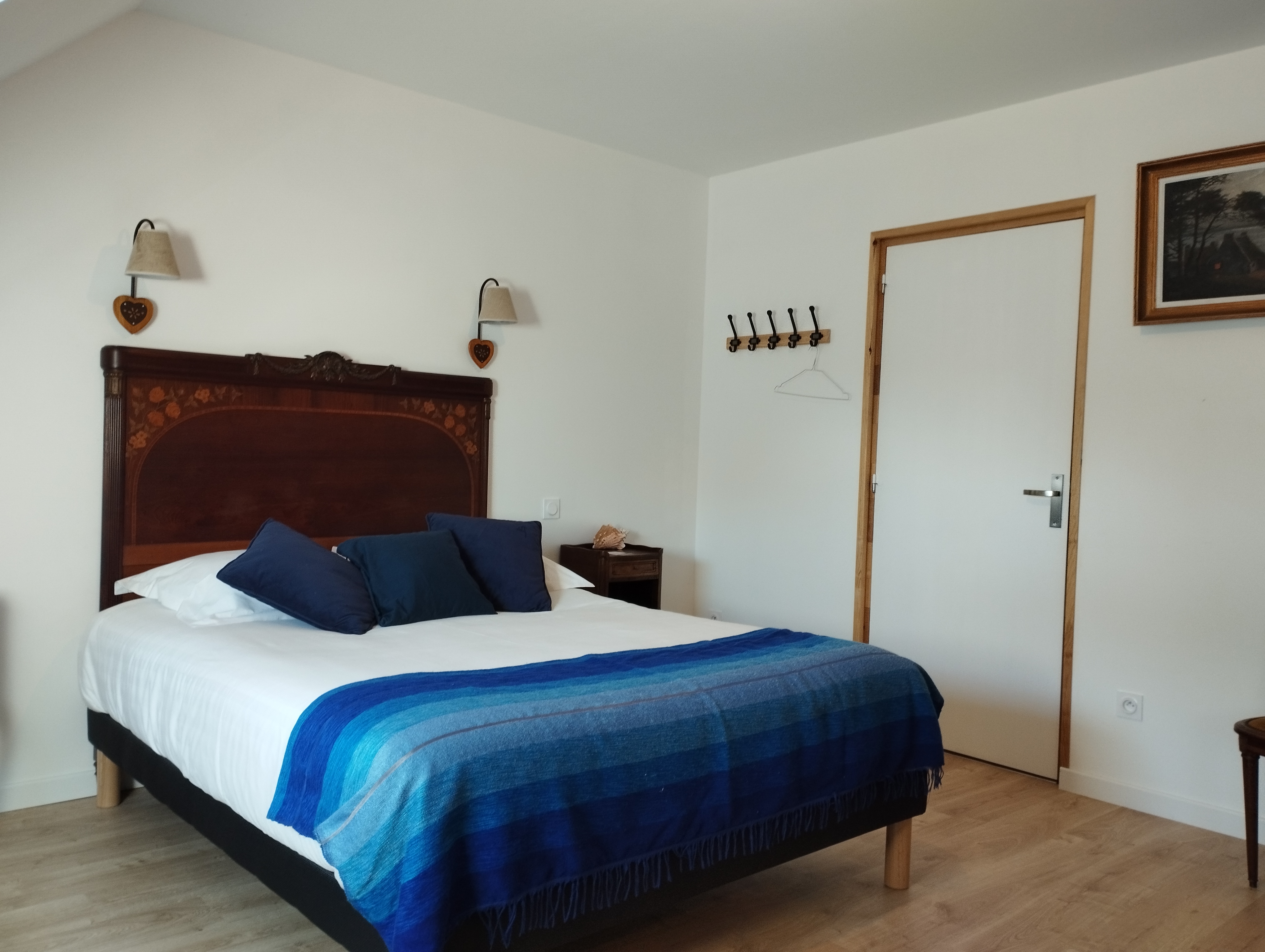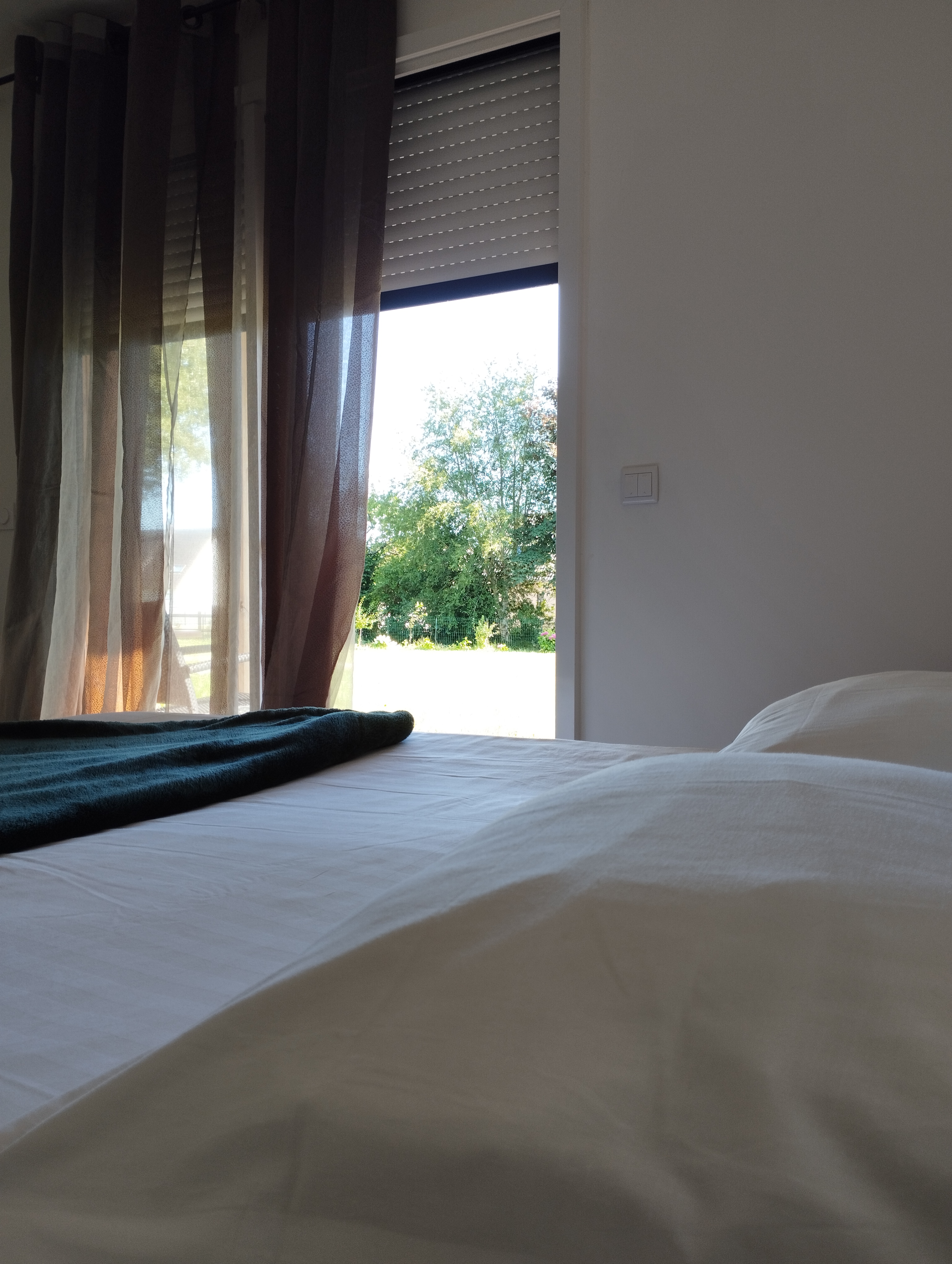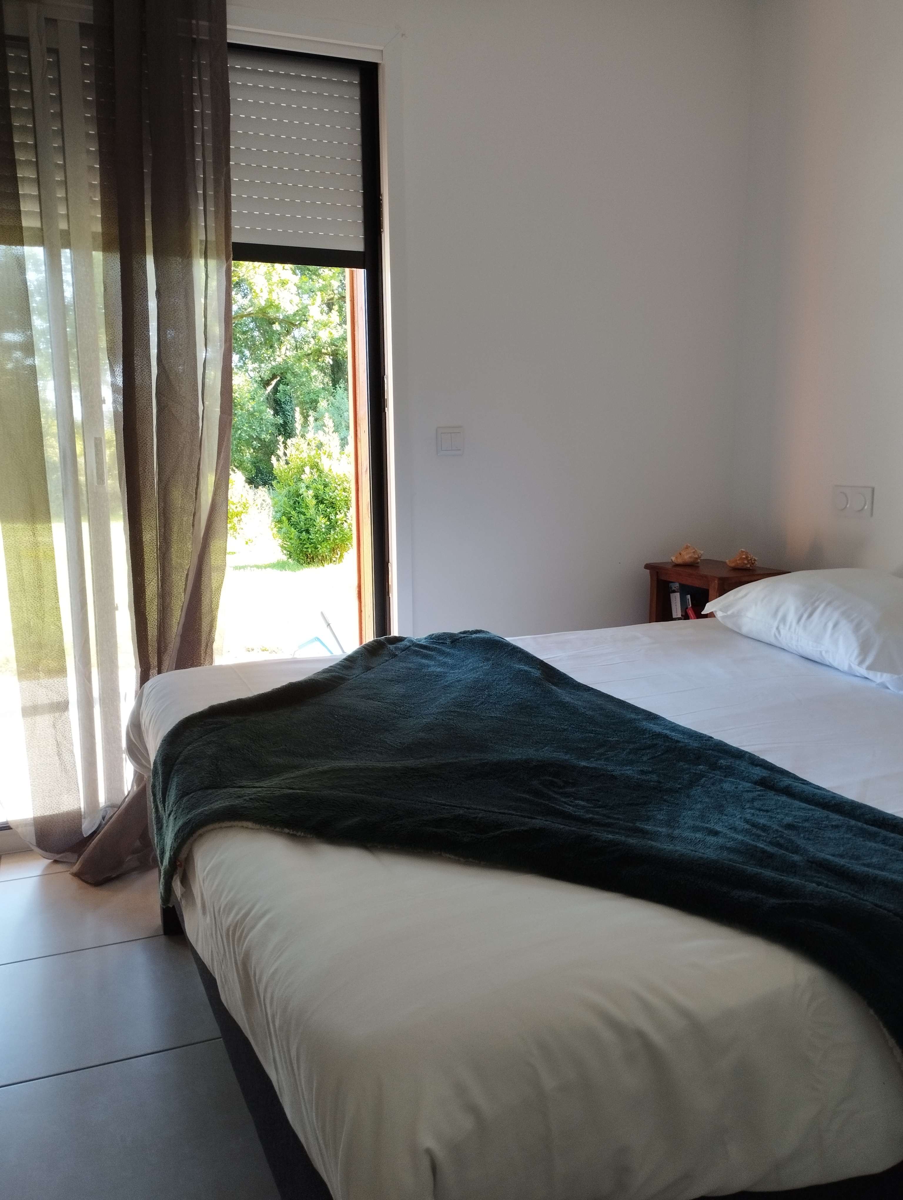 Sa grande porte fenêtre s'ouvre sur une terrasse offrant une vue sur le jardin et sa vaste pelouse. De son lit vous pouvez admirer et écouter les bruits de la nature, oiseaux, croassement venant du marais, le vent dans les arbres....