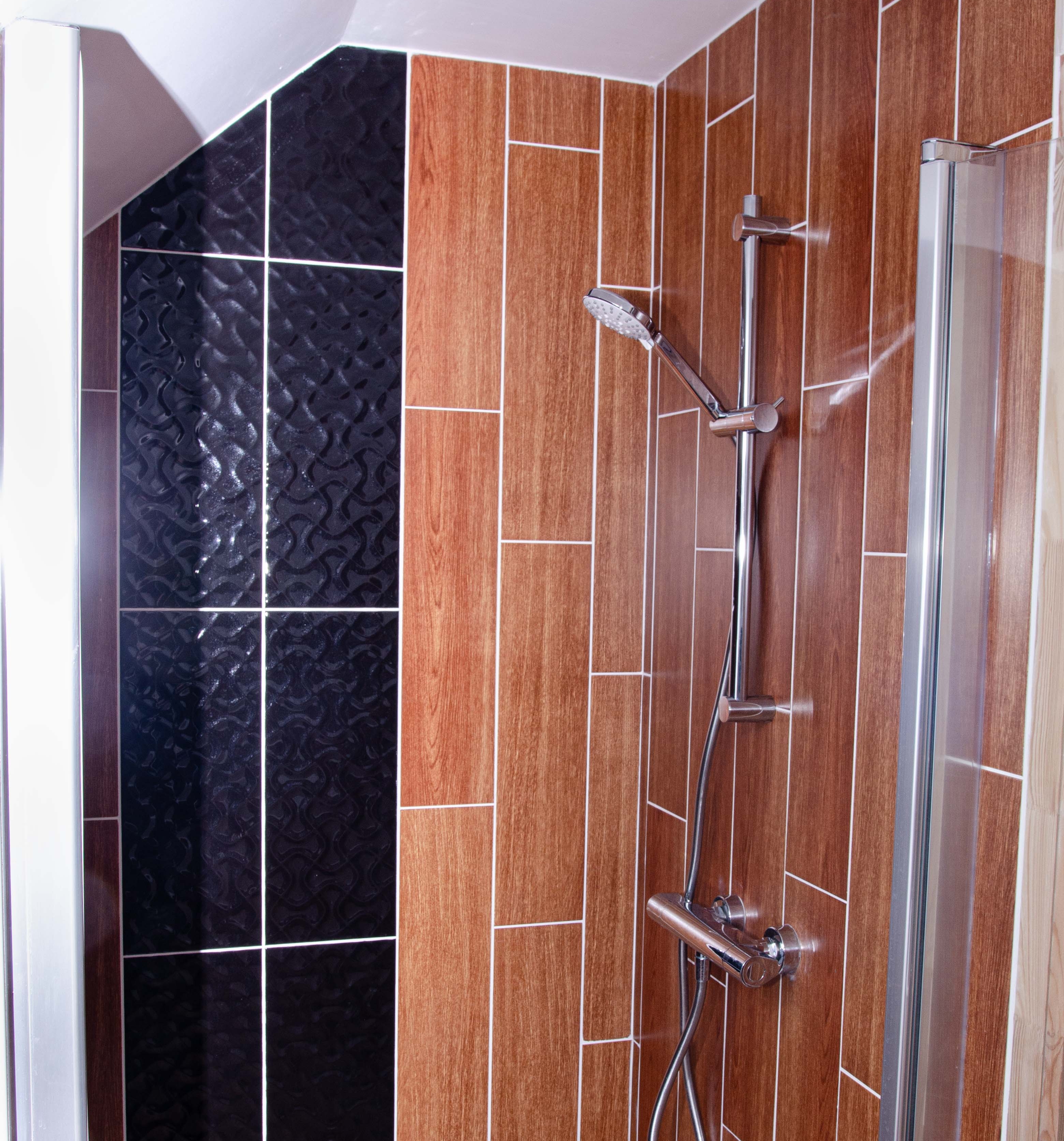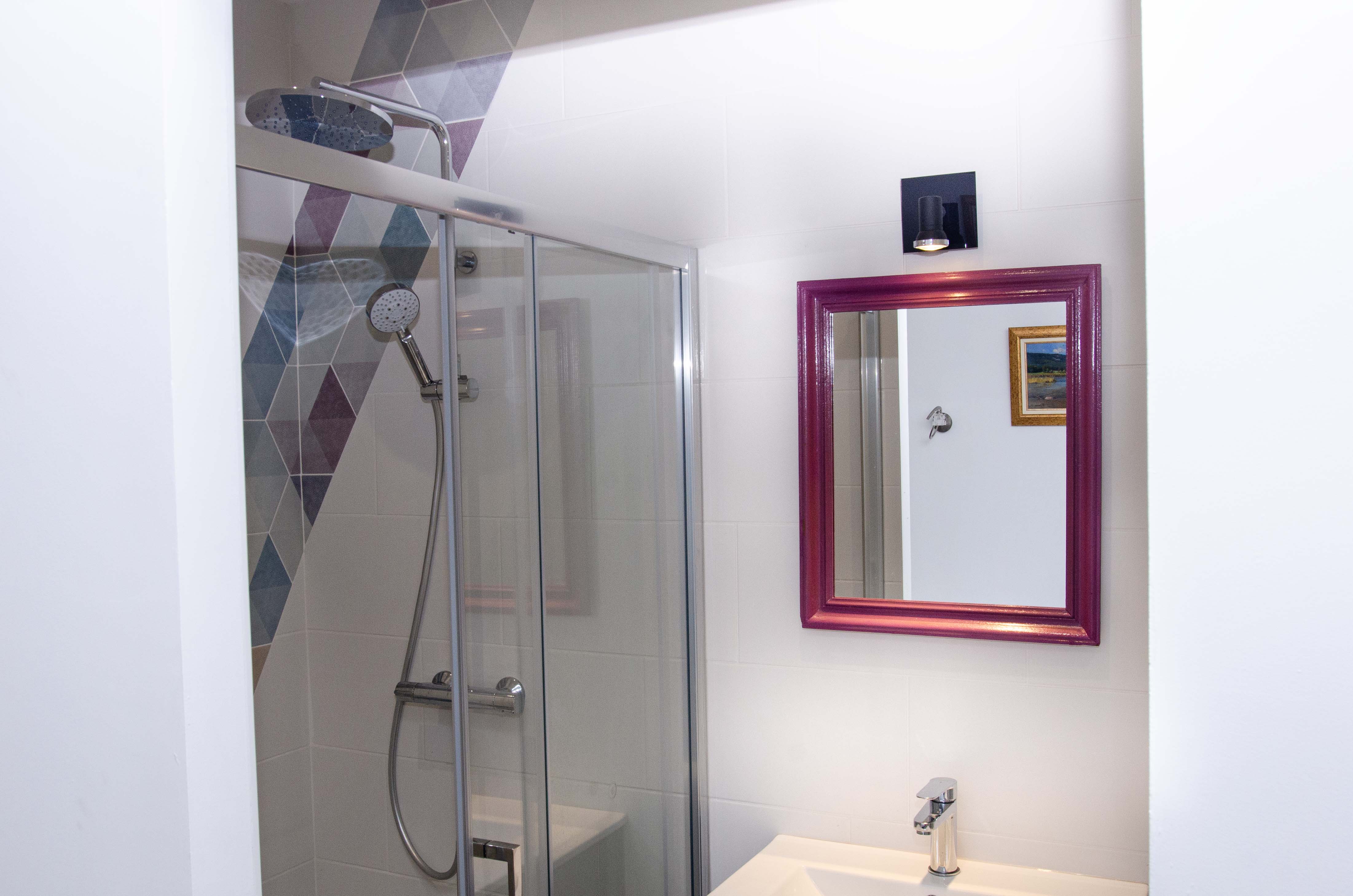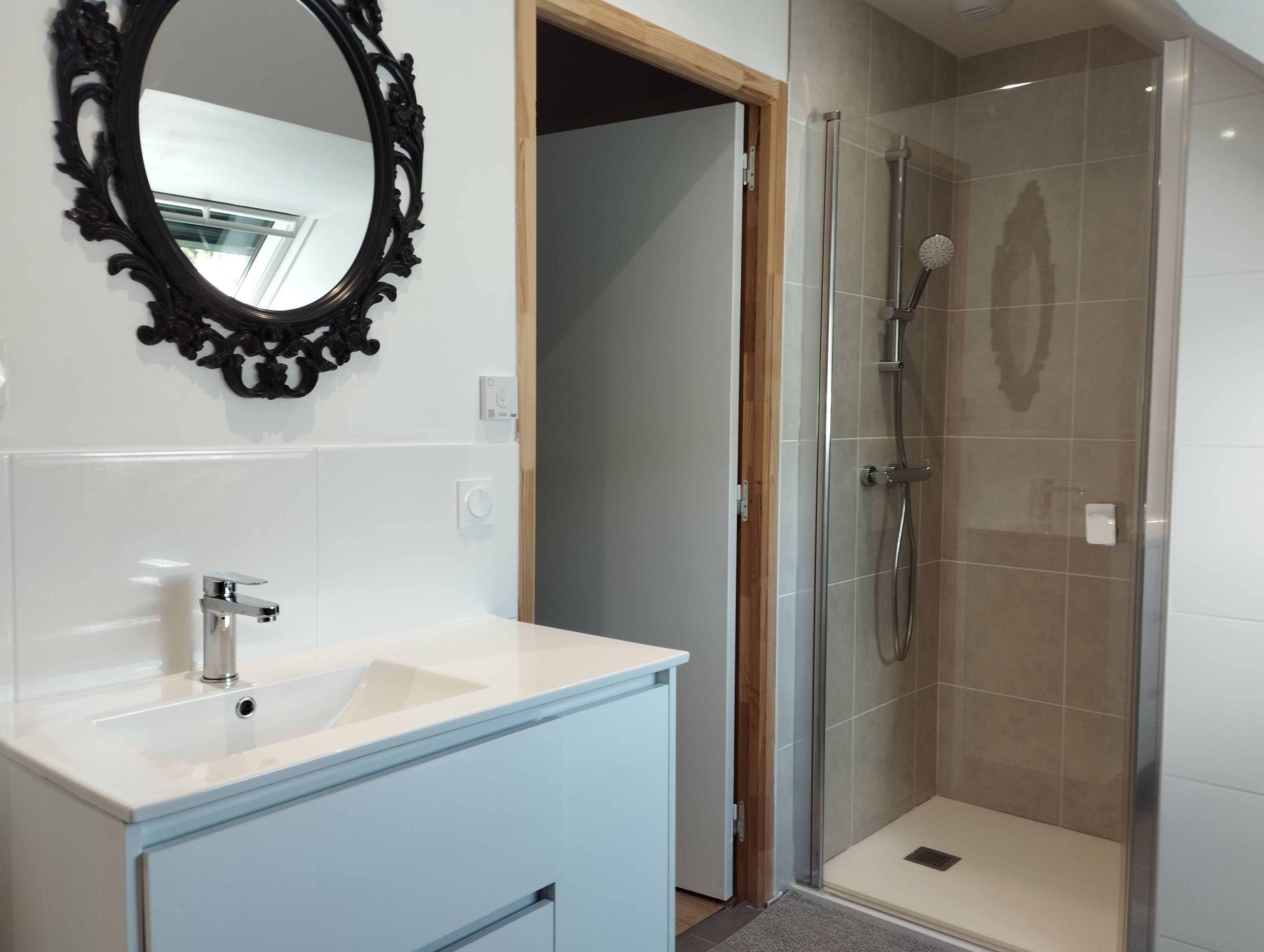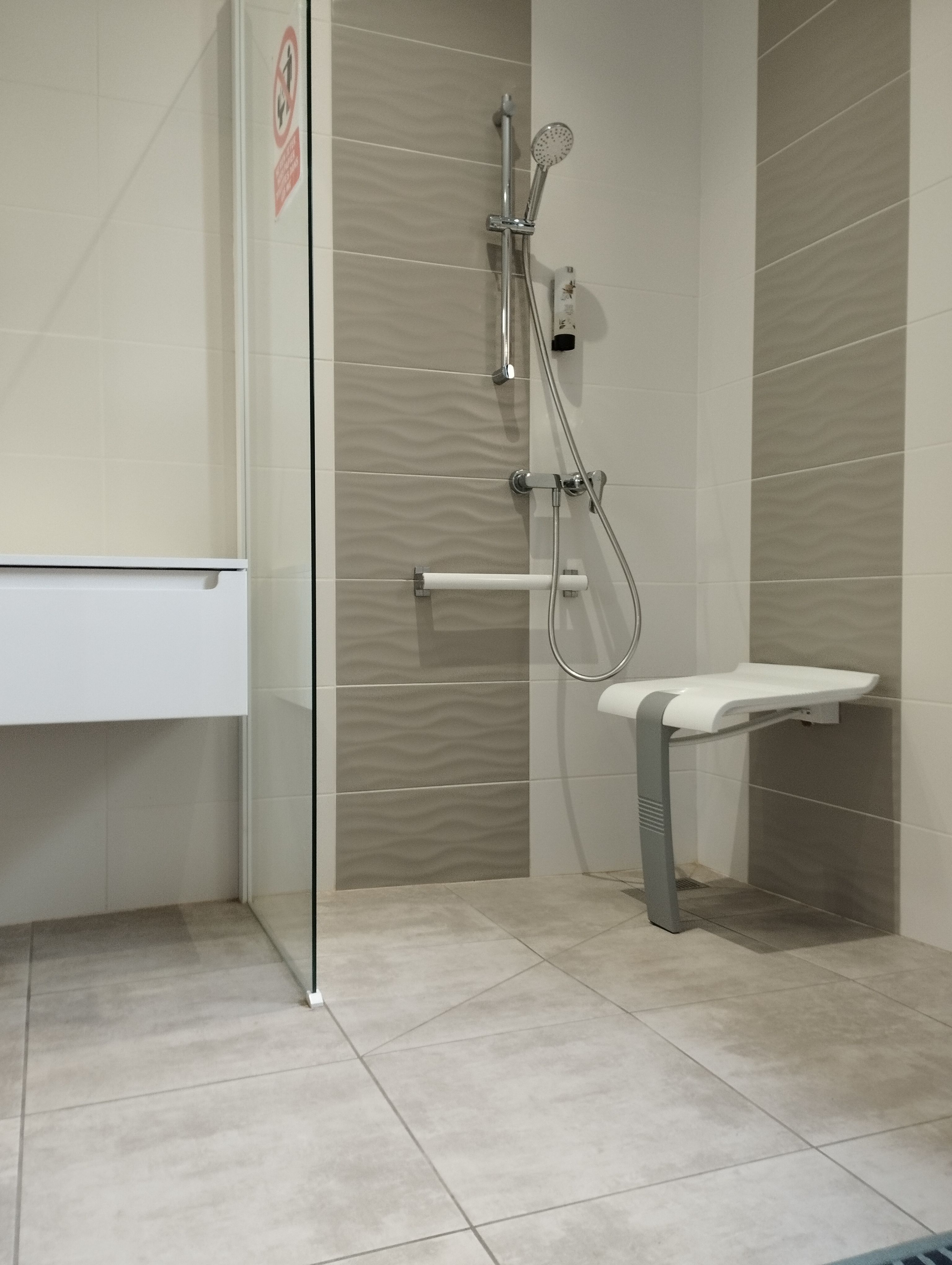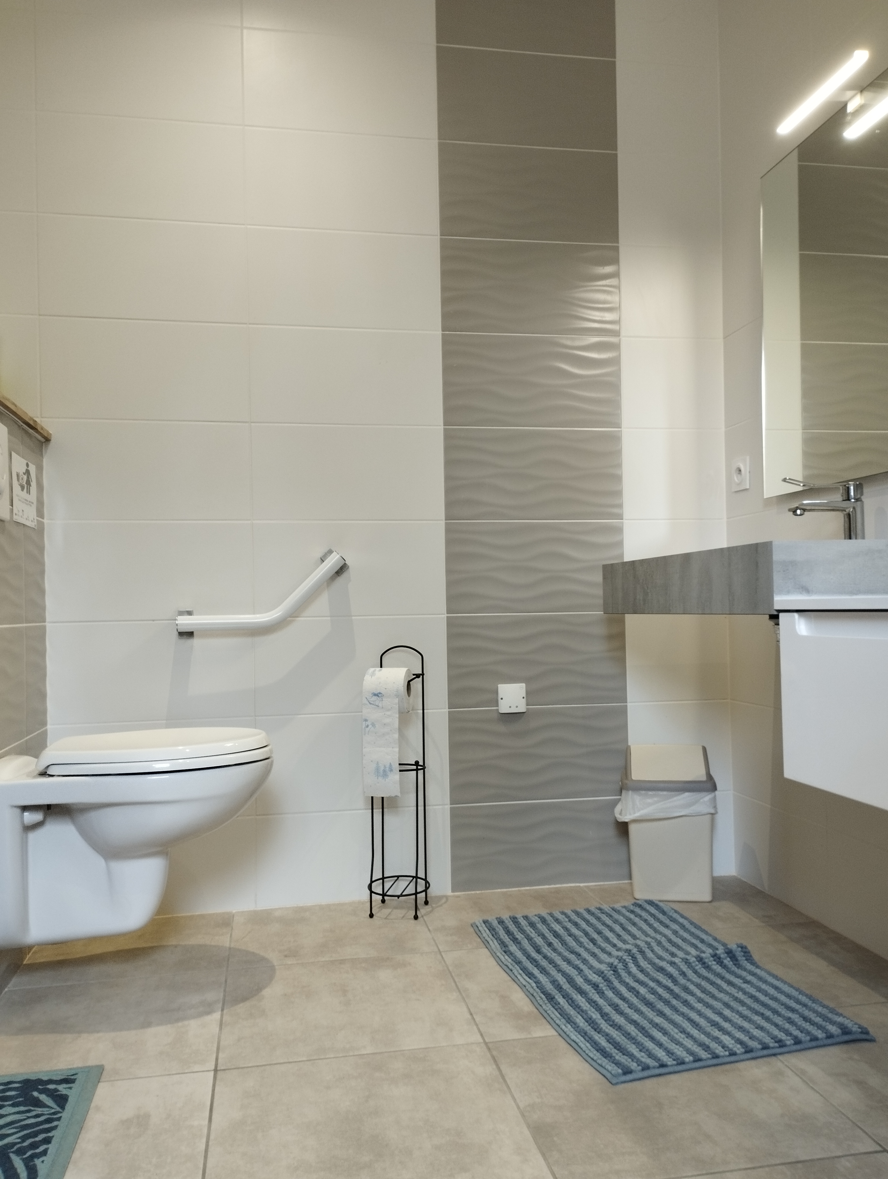Salle de bain spacieuse, adaptée aux personnes à mobilité réduite, avec douche à l’italienne accessible en fauteuil roulant.