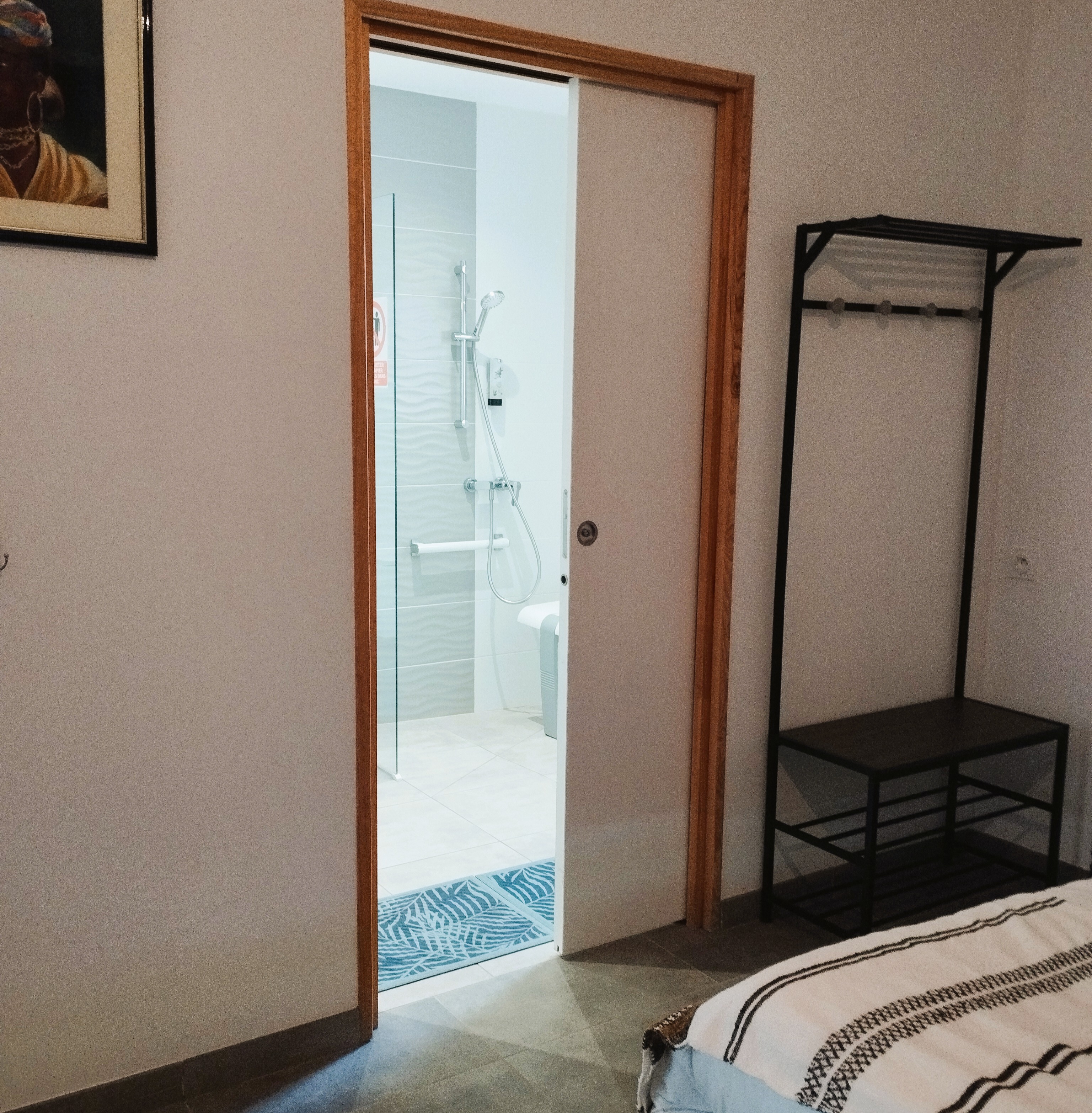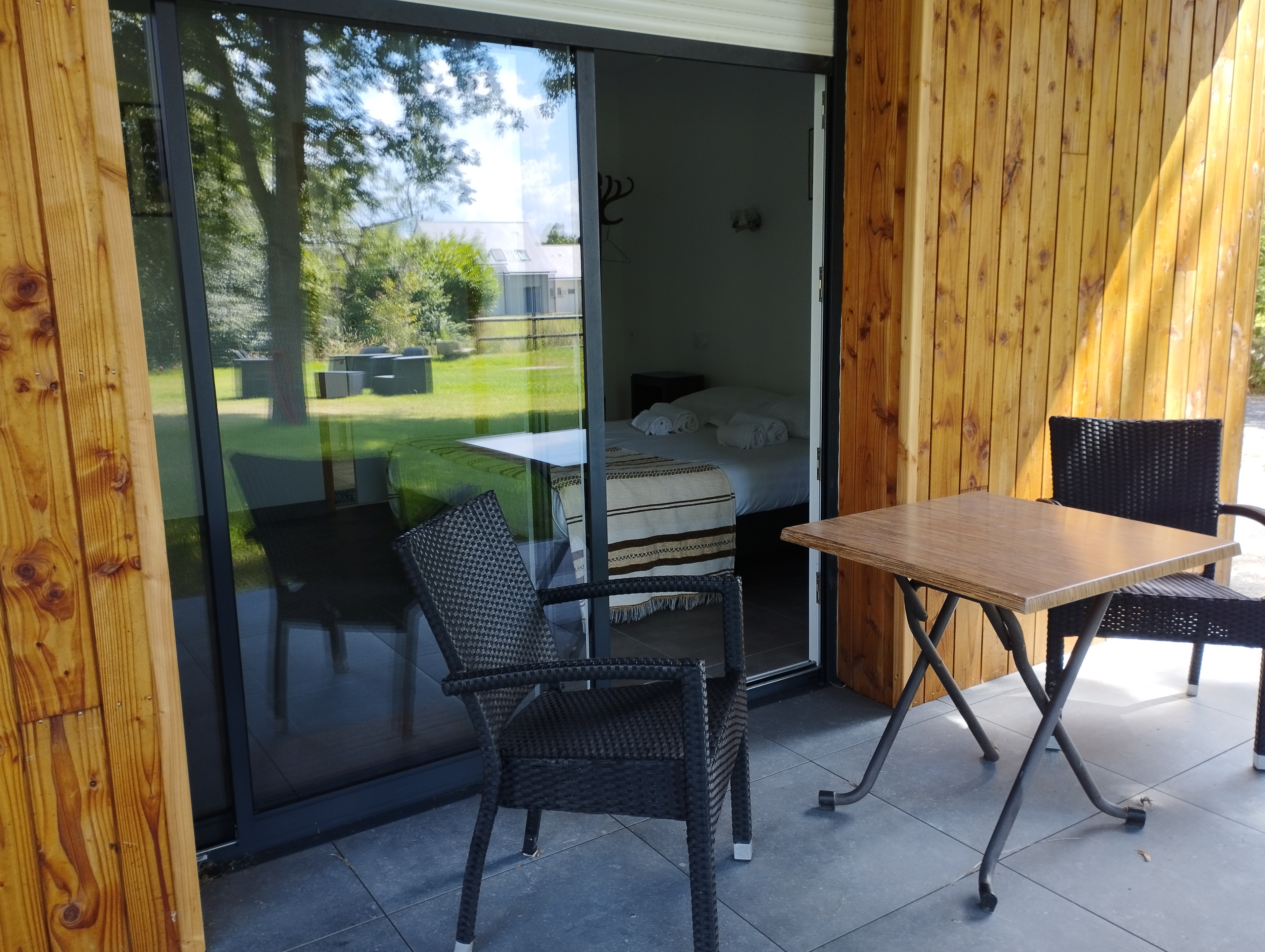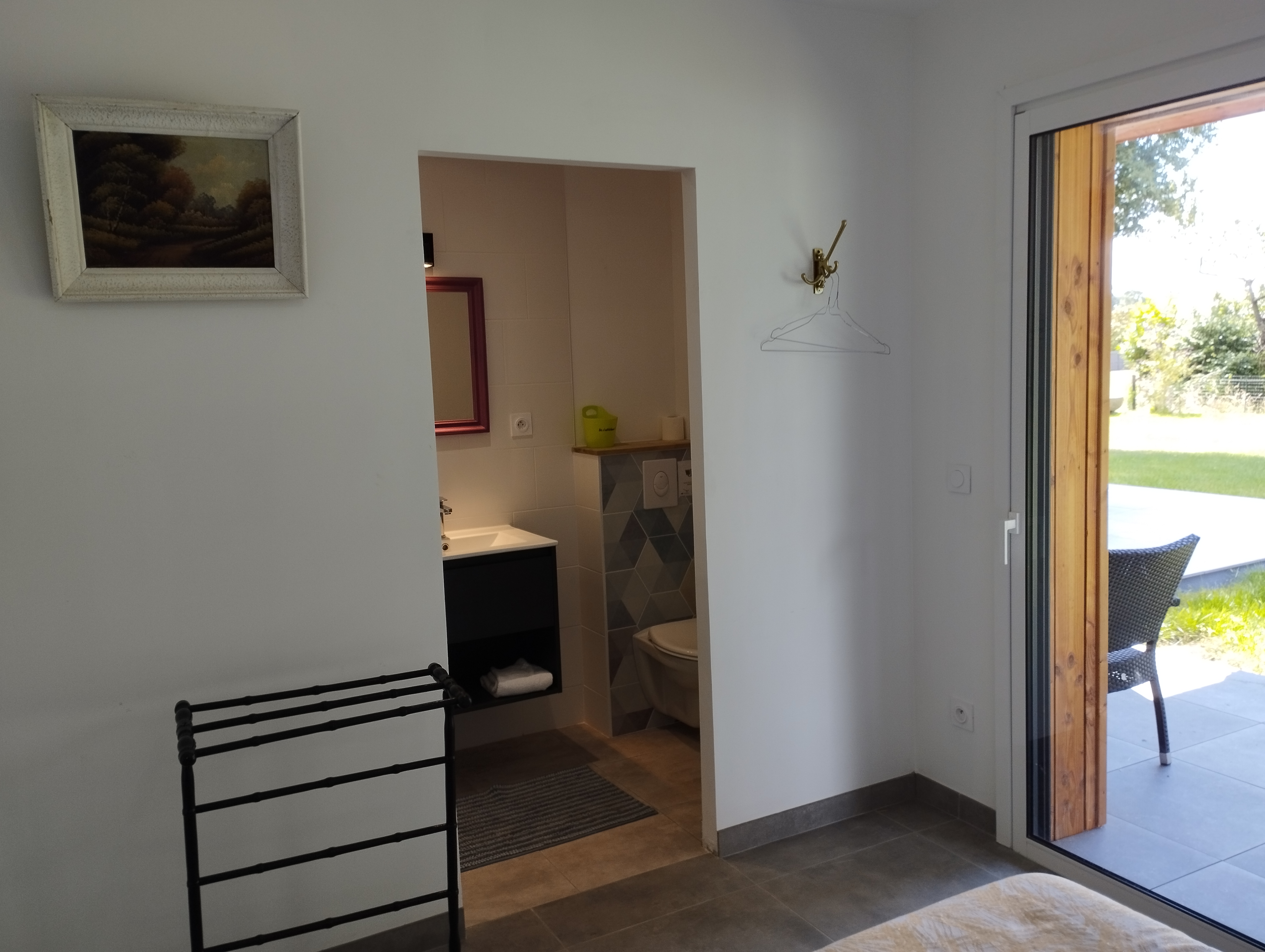 Chambre de plein pied adaptée PMR. Vous pouvez sortir sur la terrasse admirer la végétation, profiter de sa fraicheur grâce à l'auvent qui couvre toute la façade.